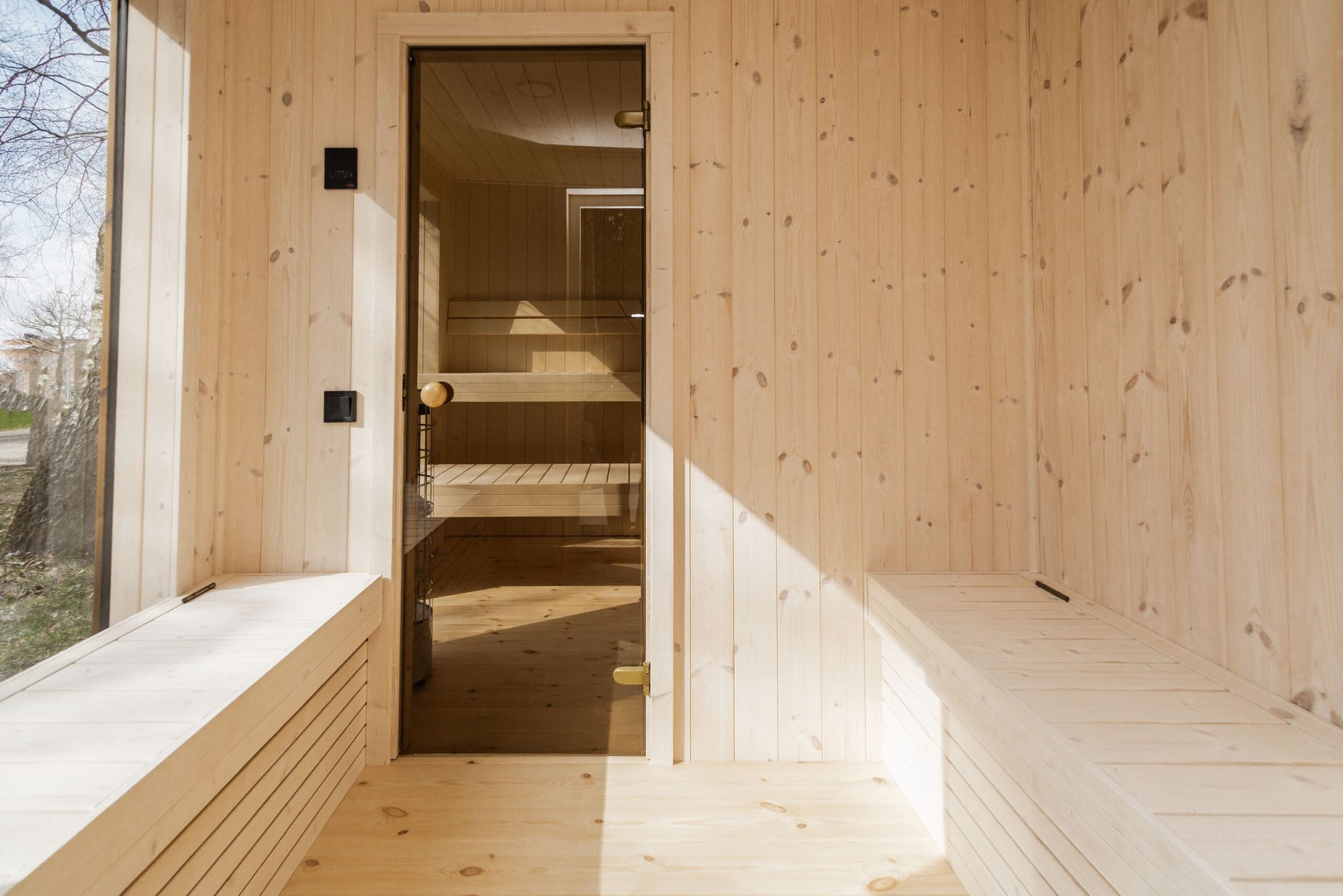 Der geräumige Saunaraum und der helle Vorraum schaffen ein perfektes Gleichgewicht zwischen Entspannung, Komfort und Stil.