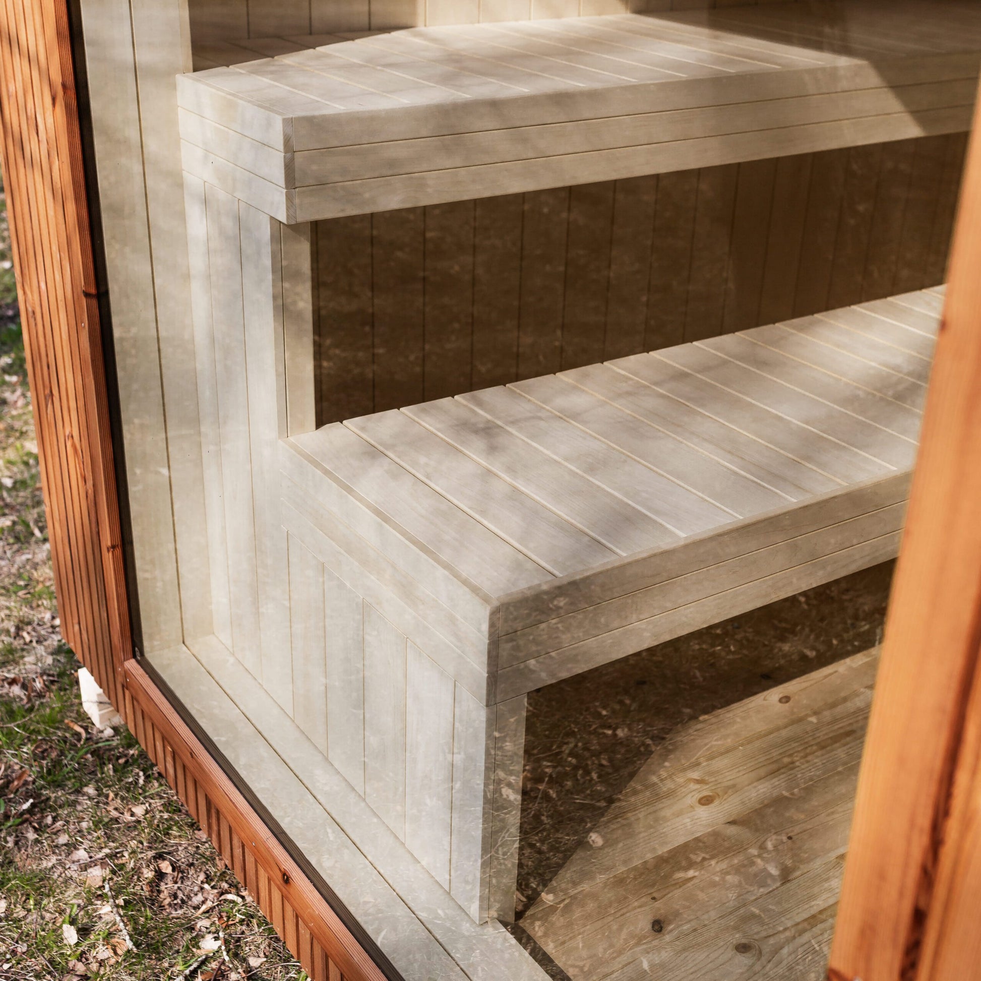 - Sauna – Fichtenholzbretter mit integriertem Wasserablauf