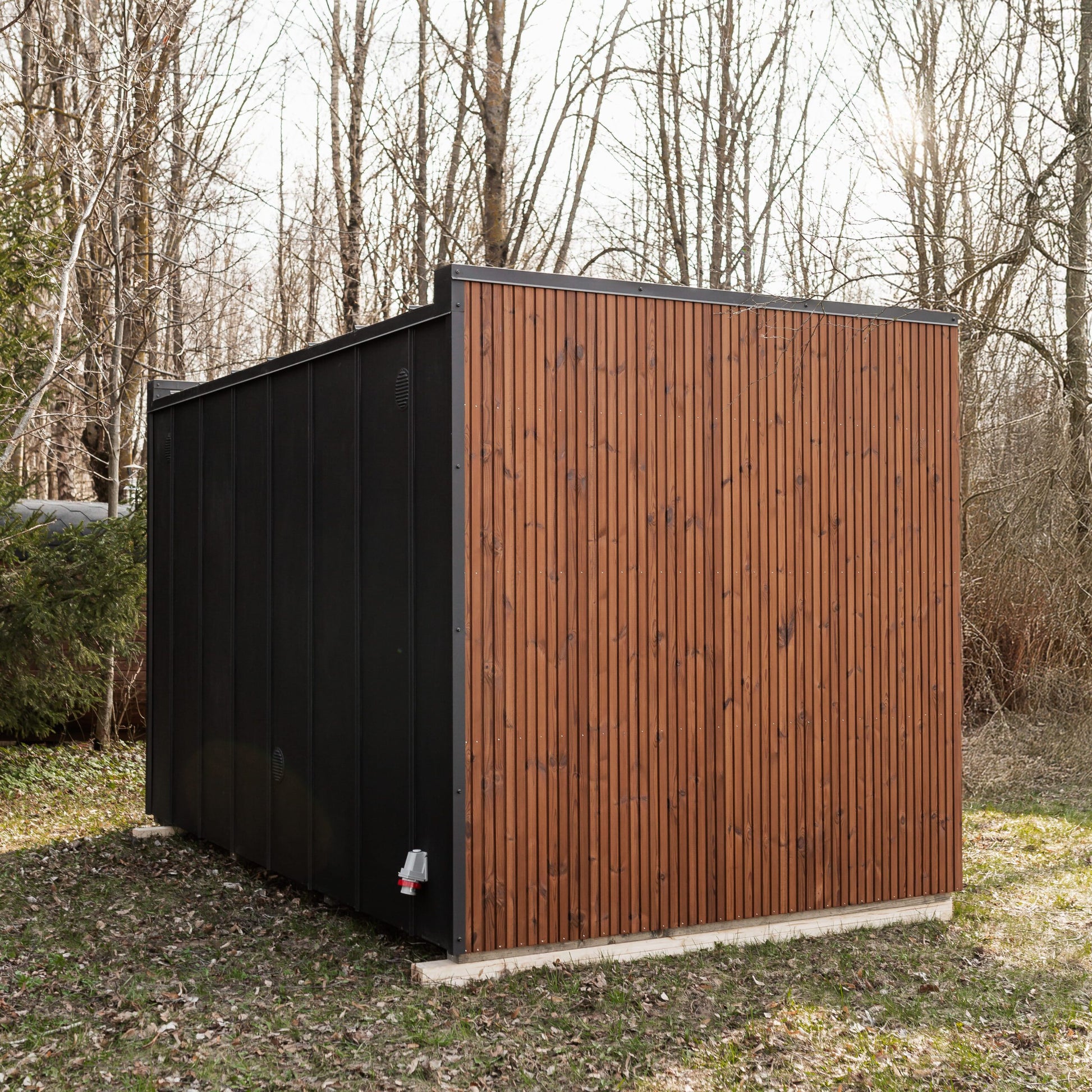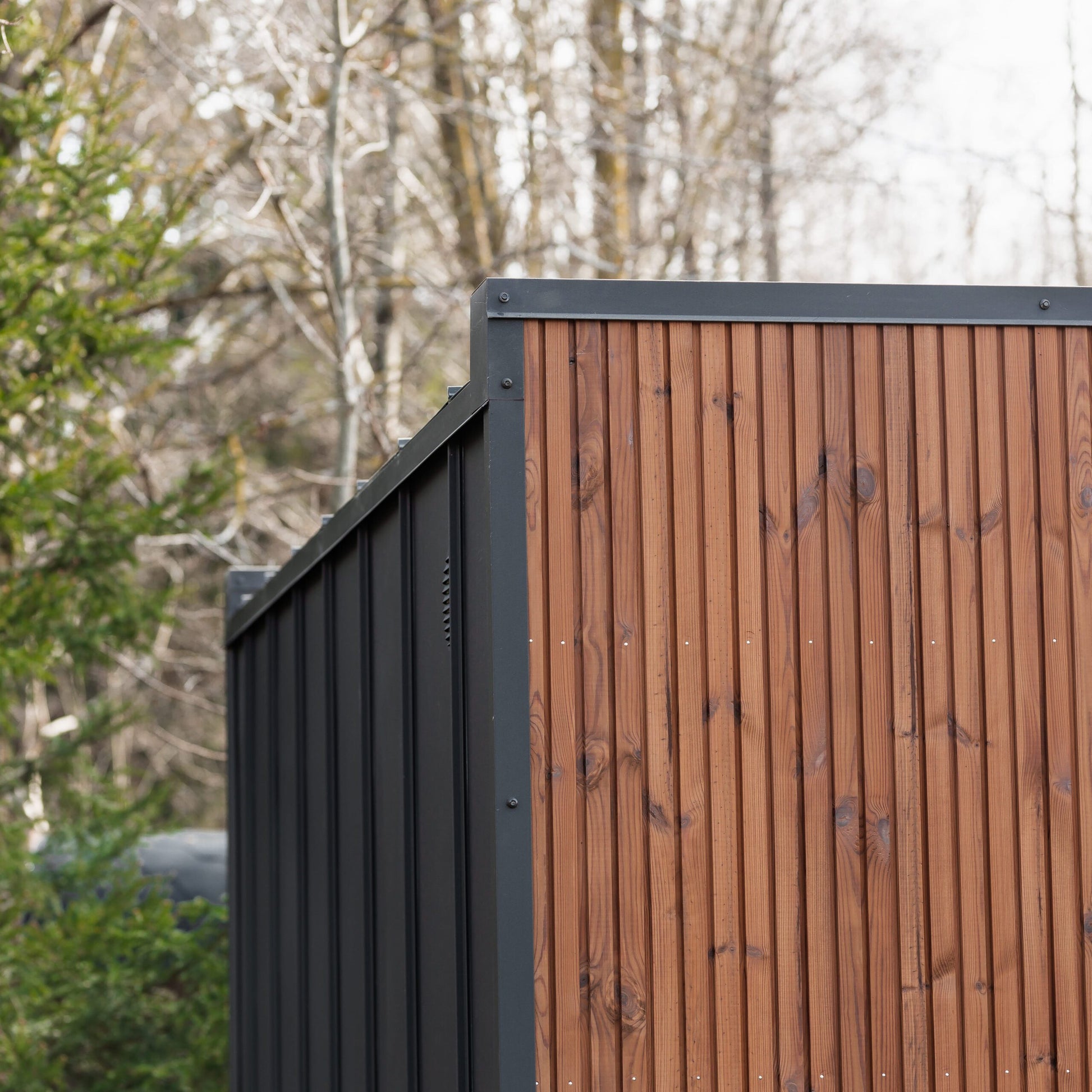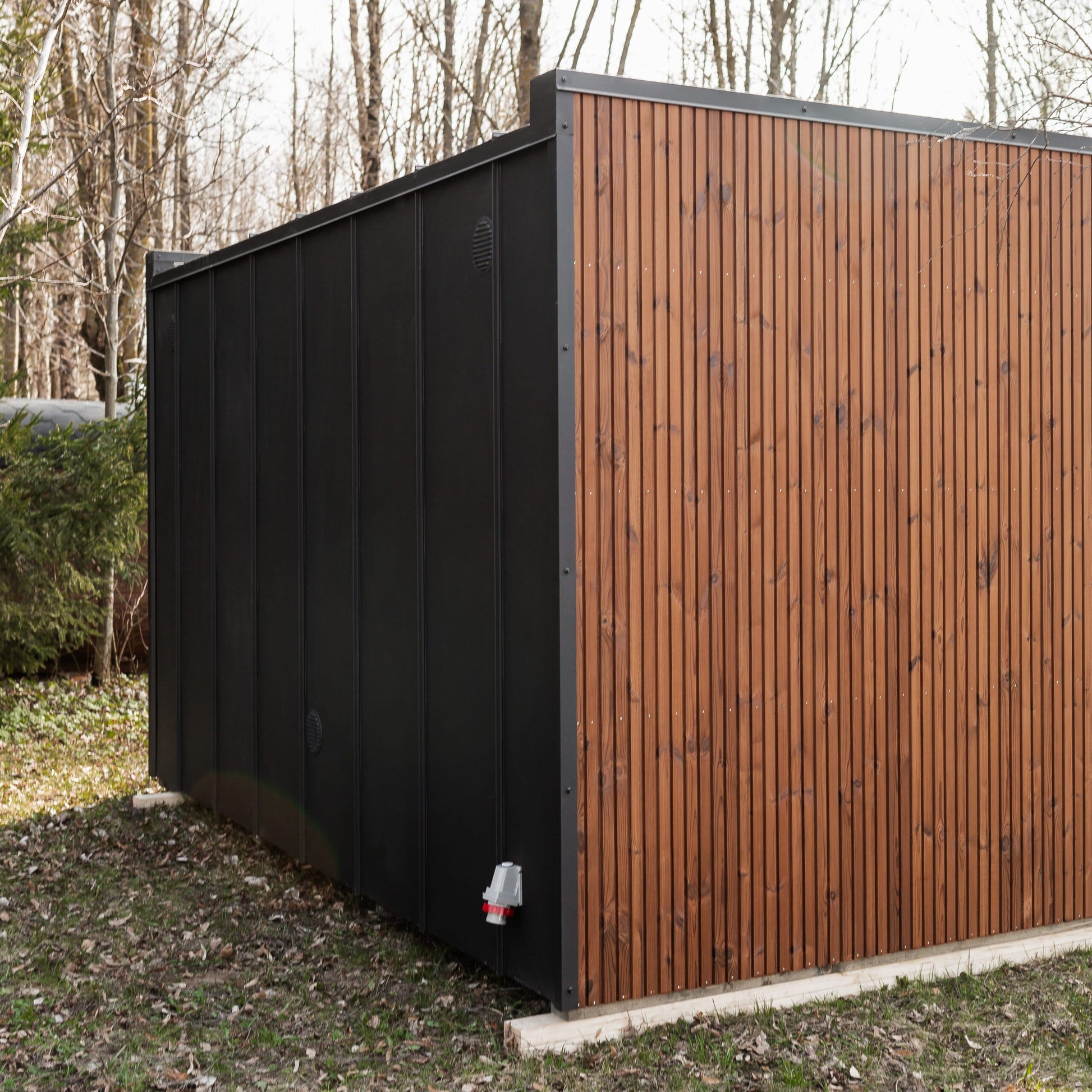 - Außenverkleidung: Dreifachleisten aus Thermoholz mit einer CLASIC-Blechrückwand – eine moderne und langlebige Kombination, die natürliche Holzästhetik mit Witterungsschutz verbindet.
