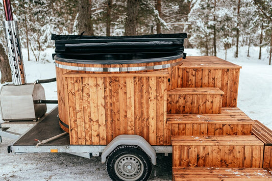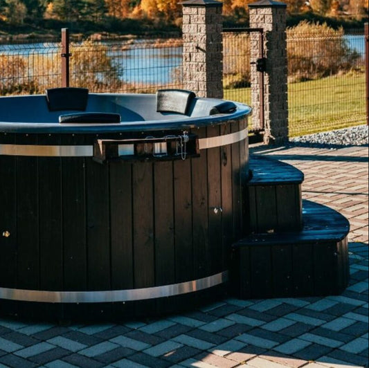 • Fiberglass hot tub with integrated wooden heater, surrounded by gravel, with a wooden step leading to its entrance.
