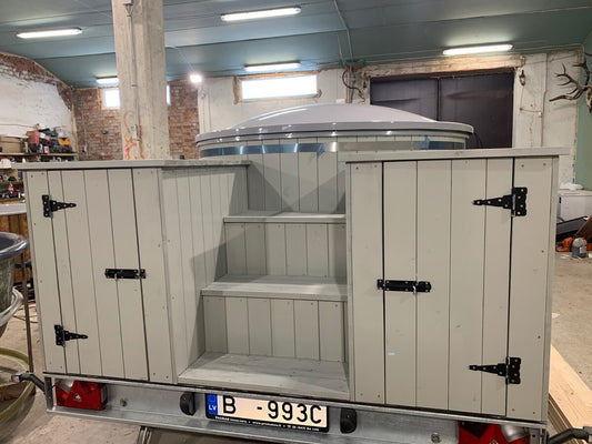 • FIBERGLASS HOT TUB WITH OUTDOOR OVEN with ladder and lockers for firewood and step
