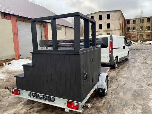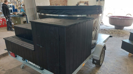 FIBERGLASS HOT TUB WITH OUTDOOR OVEN with ladder and lockers for firewood and step