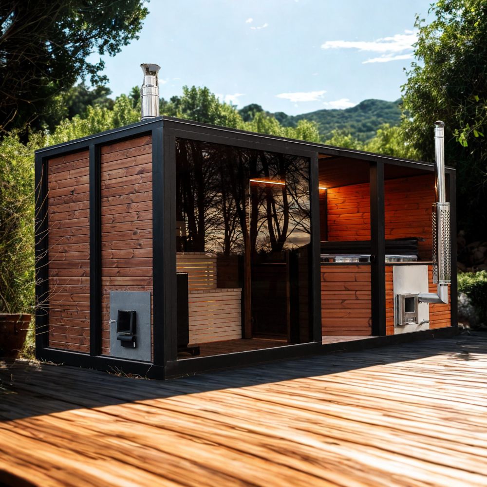 - Complete outdoor wellness unit combining sauna + hot tub