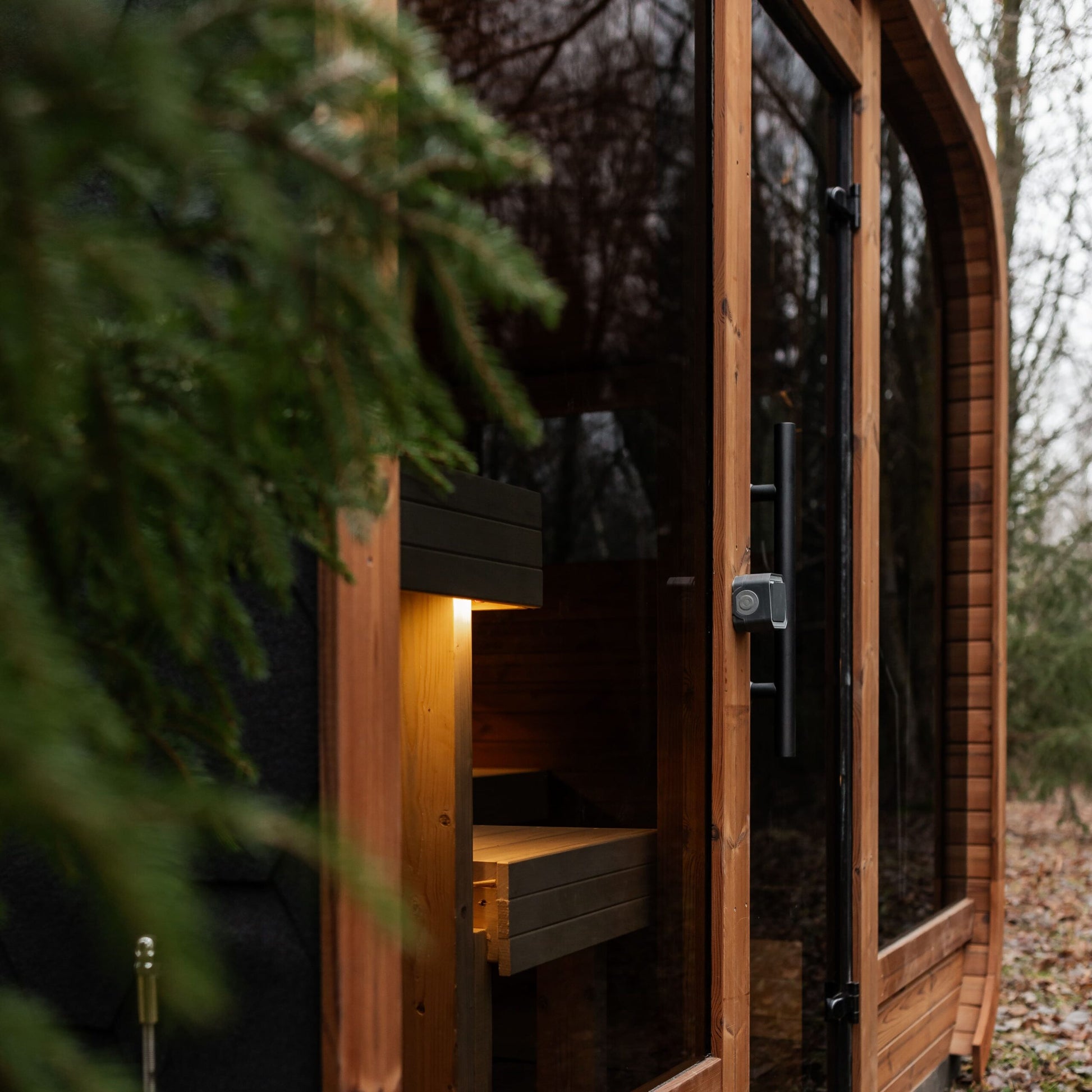 A single HARVIA lamp adds a gentle glow to the interior, while integrated ventilation ensures balanced airflow and fresh air circulation.